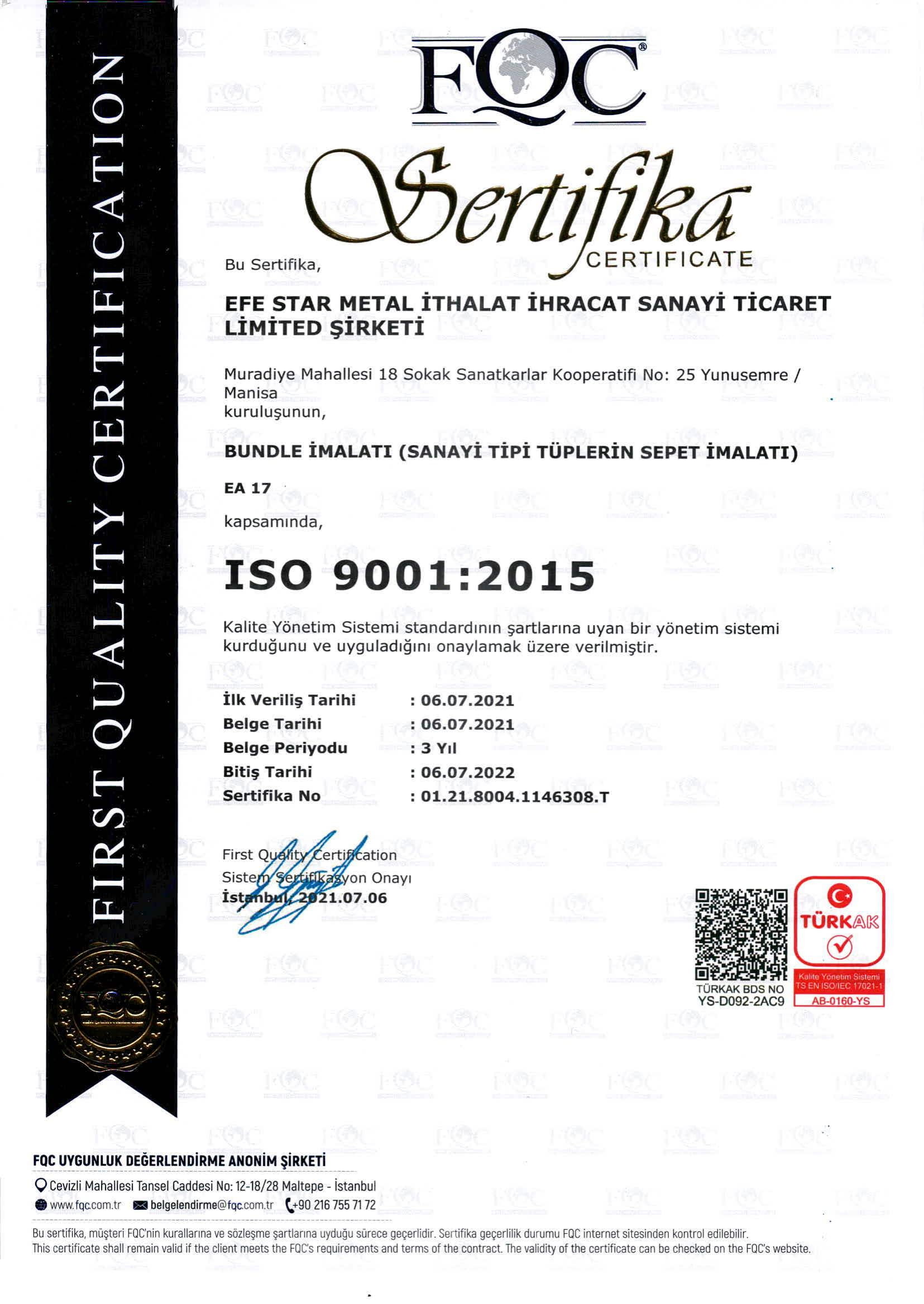 Firmamız; ISO 9001 Kalite Yönetim Sistemi Yönetim Sistemi standardı gereklerini yerine getirerek;